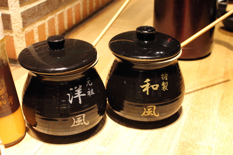 桌上有大大小小瓶瓶罐罐,除了醬菜之外,還有洋式與和式的豬排醬。