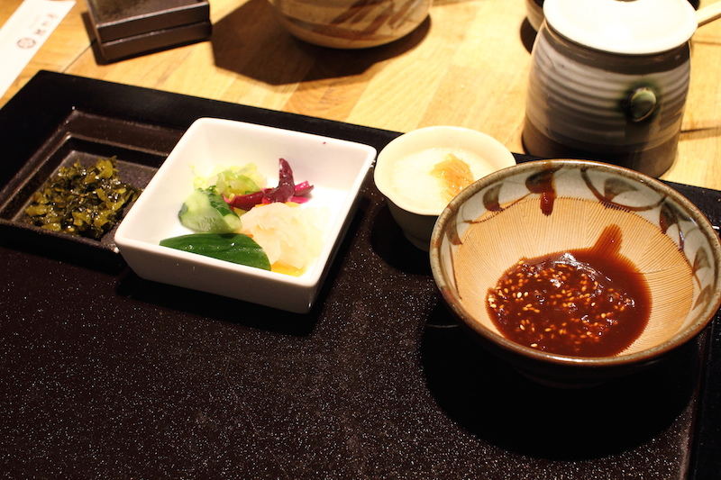 服務人原先送上一碟漬菜以及大家都不陌生的磨芝麻用的器具,結果我一時腦殘,芝麻倒入小缽中忘記磨碎,直接把豬排醬加進去,結果就是芝麻香氣都沒出來。