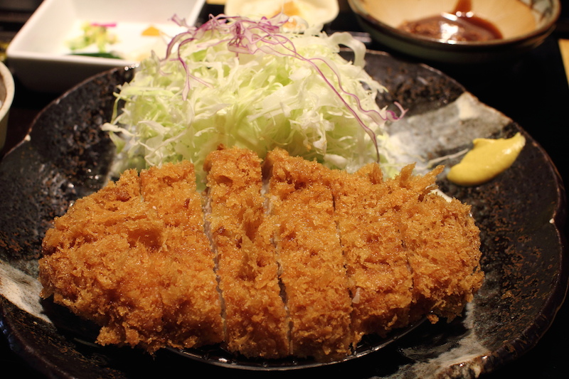 等了一會兒,炸豬排終於送上,搭配一碗米飯與赤味噌湯。高麗菜絲也是必備的,可以選擇加義式油醋或是和風醬。豬排的份量不小,麵衣使用細麵包粉,炸的十分酥脆又沒有餘油,另外似乎還灑了點鹽提味,本身就挺鹹的,有時再沾醬的話,口味就太重了。