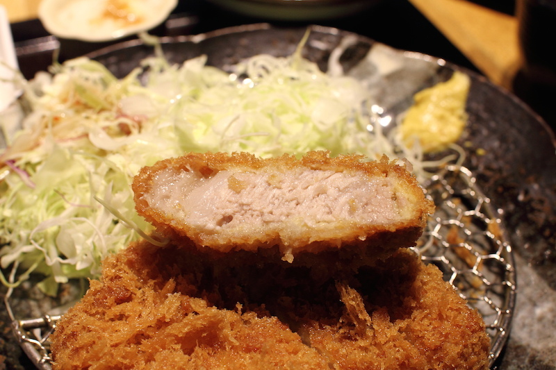 里肌肉排厚度大約是一元硬幣的大小,從切面可以看到豬肉仍蘭保持肉汁,閃閃亮亮。麵衣酥脆,而裡頭的豬肉卻是非常柔軟鬆綿,只用牙齒輕輕不出力地一咬,豬肉就斷了開來,在口中咀嚼很快就化開,滿滿的豬肉甜味,尤其是麵衣灑了鹽,鹽味更能提出肉本身的甜味。只是有幾塊鹽下太重,有點過鹹。