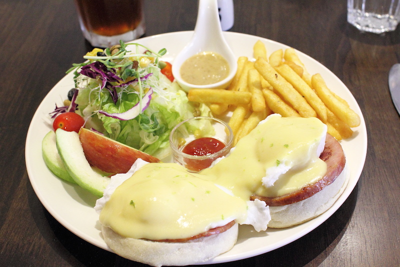 班尼迪克蛋應該是最費工夫的一道,份量蠻豐盛的,炸薯條、大量的生菜與水果加上兩個瑪芬麵包搭配圓火腿與水煮蛋包,淋上荷蘭醬。