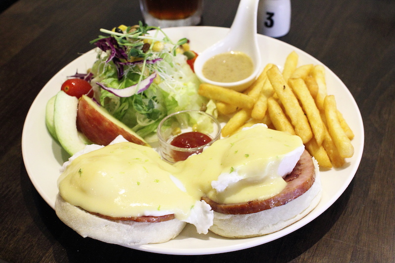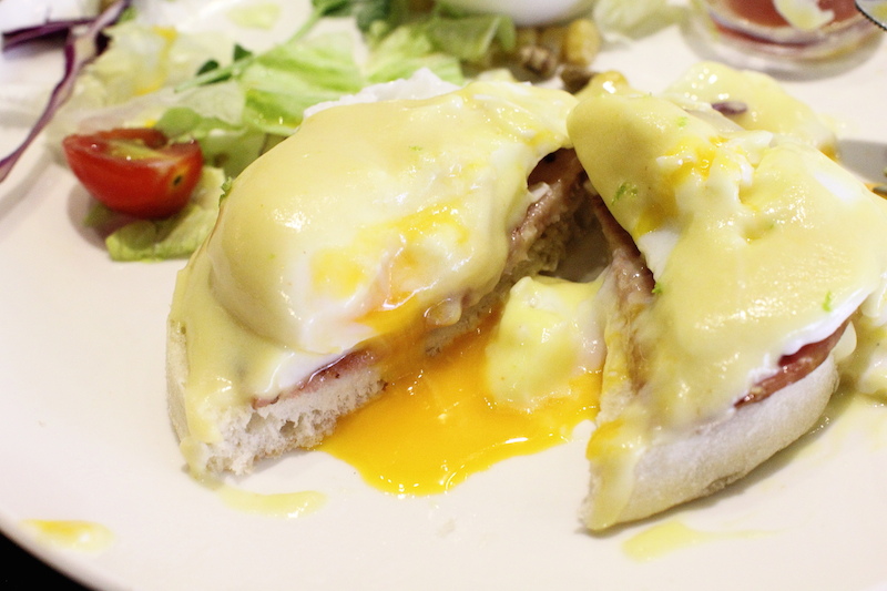 切開蛋包,其中一個有點過熟,蛋黃凝固了七成,另一個熟度好一點,切開來蛋黃緩緩流出。荷蘭醬的味道偏甜,與鹹香火腿配著滑嫩蛋包和有嚼勁的麵包一起入口,口感倒是扎實。一盤班尼迪克蛋吃下來,作為早餐飽食感十足,不過也就無太多令人感到特別之處。大多數的早午餐店吃來吃去也差不多是這些東西,填飽肚子還可,味道大同小異,可說中規中矩而已。