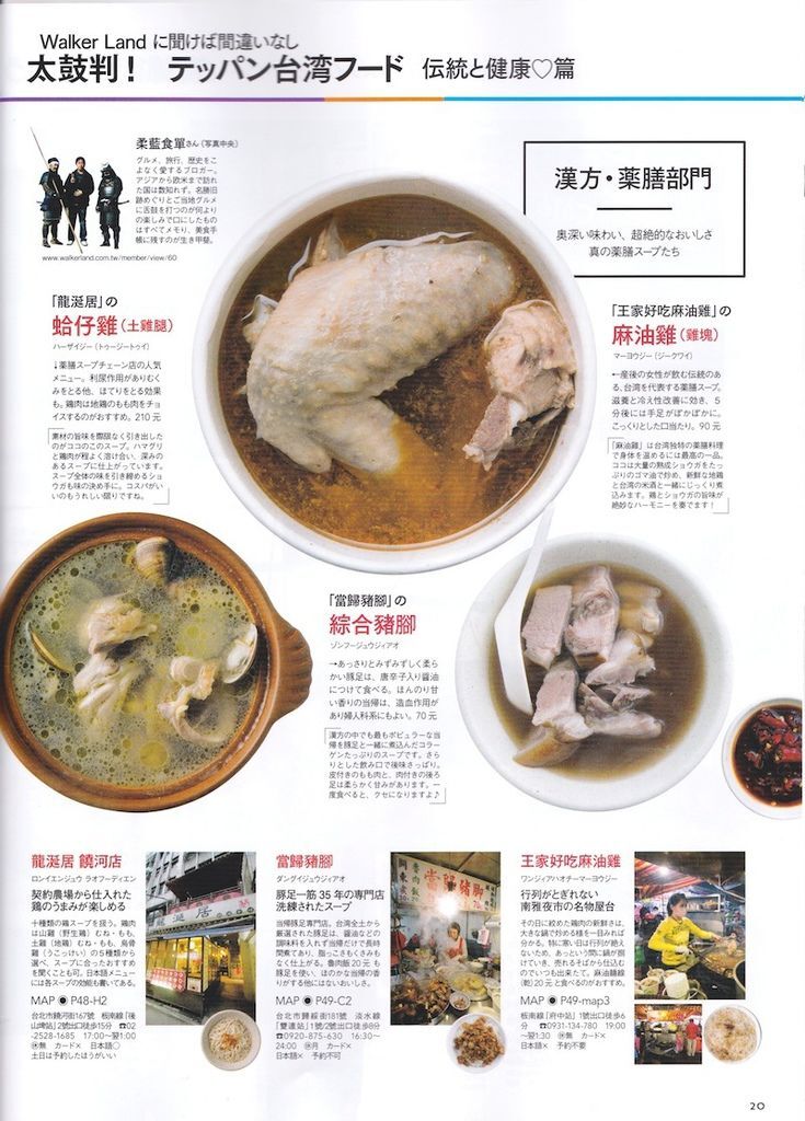 這三間分別是連鎖店龍涎居、歸綏街的當歸豬腳以及我從小吃到大的板橋南雅夜市麻油雞。不過我挺好奇日本人真的敢吃這些藥膳或麻油雞嗎?喔,還有我在這雜誌裡露臉了,跟兩個日本武士的合照。難得我會露出正面,還好雜誌只在日本發行,日本也沒人認識我。