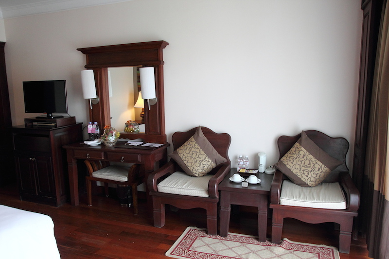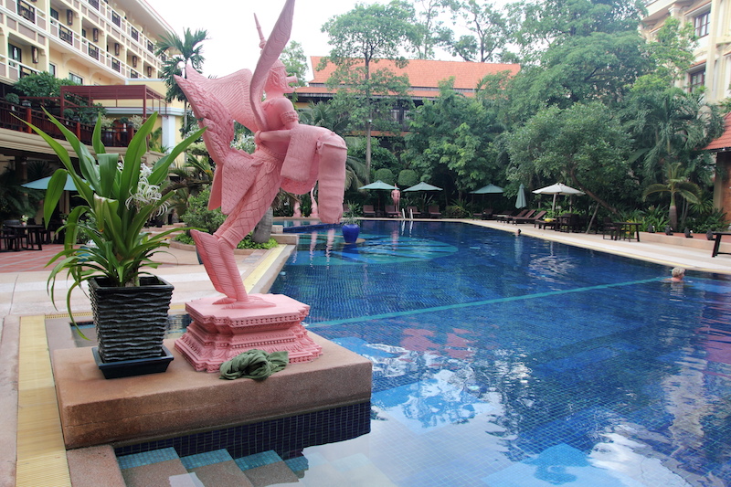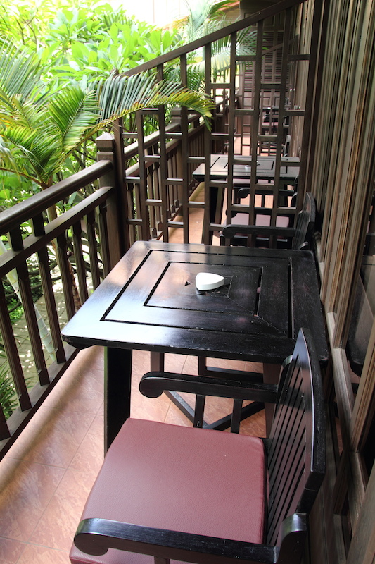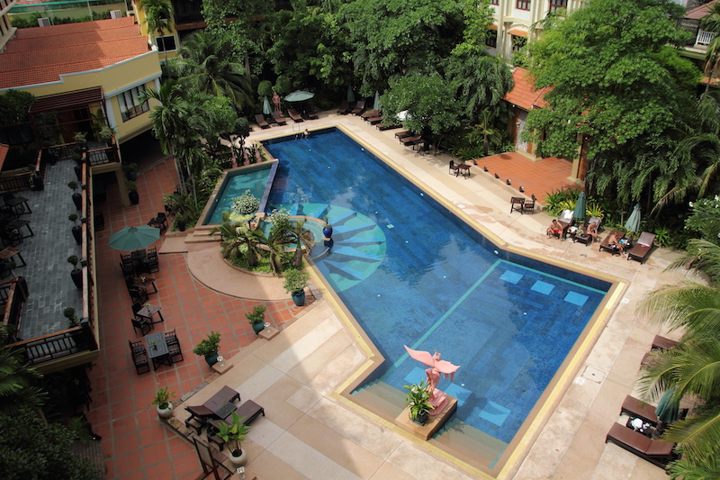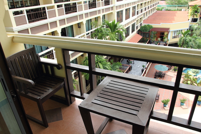 房間附設一個小陽台,陽台外面就是游泳池,東南亞的旅館,泳池是必備的,從泰國住到柬埔寨,還沒見過哪間旅館沒有游泳池。