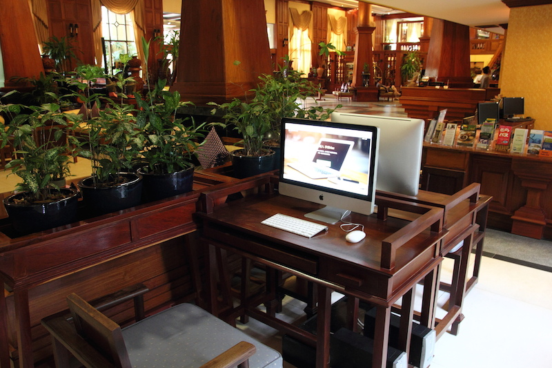 大廳旁的商務中心還附設了兩台iMac可以使用,我發現暹粒市區也有蘋果的授權商店,蘋果真是太強大了,行銷全世界,事實上我看柬埔寨人也不少拿iPhone。