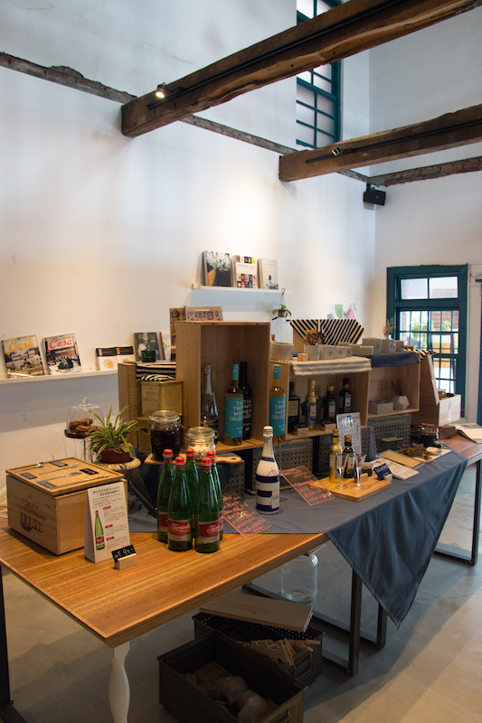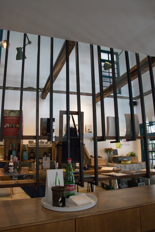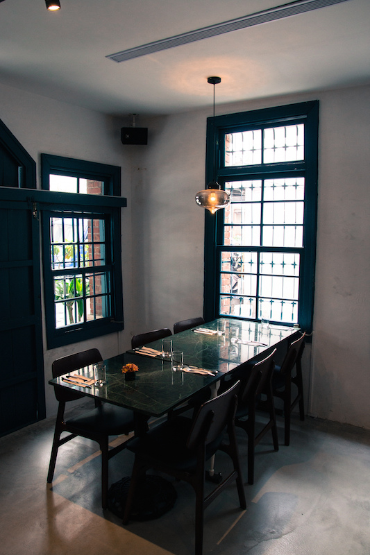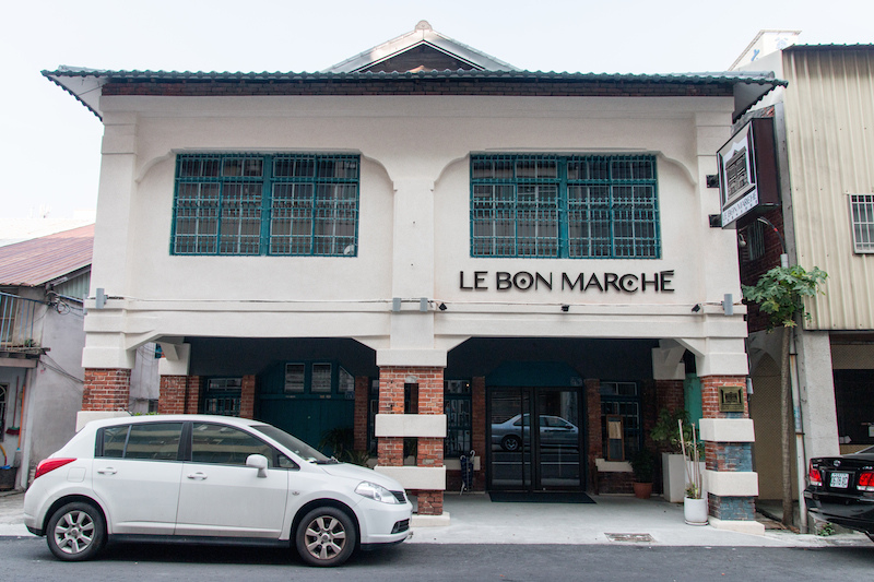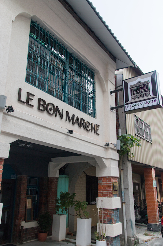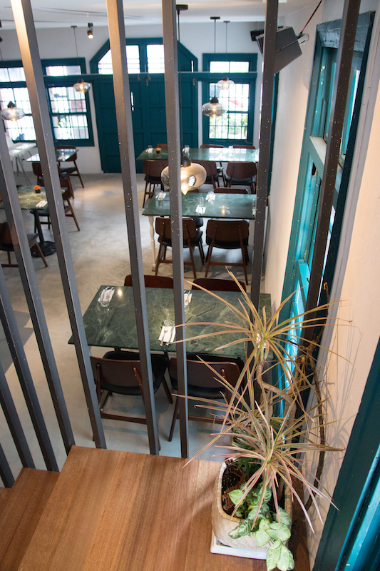 老洋樓改建的餐廳,其配色恰好合我喜好,白色水泥牆面與紅磚頭柱,藍色的木門鐵窗。