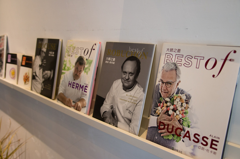 靠牆的書架上有世界名廚的食譜書,幾乎都是米其林星級主廚,例如Robuchon。