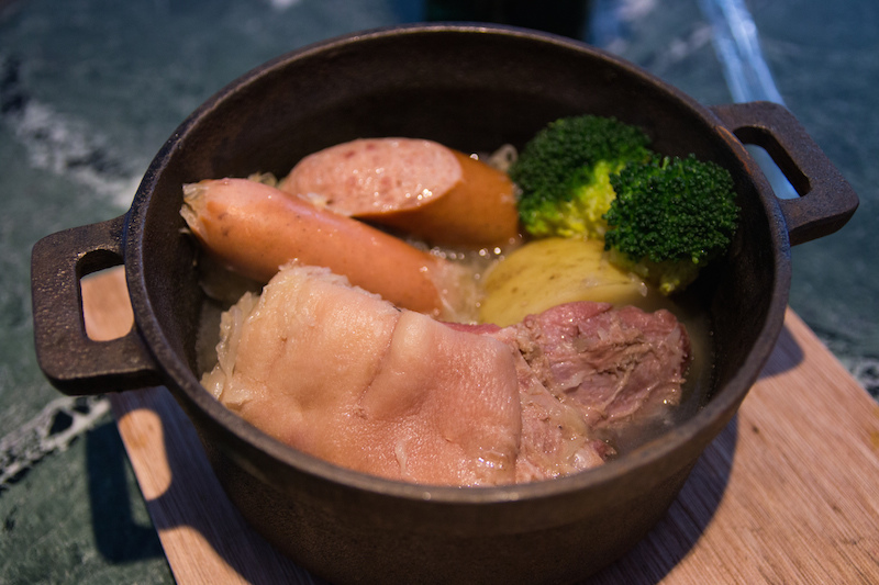 比較少見的豬腳燉鍋,小鑄鐵鍋裡有一塊帶皮豬腳肉、馬鈴薯、培根、酸菜以及德國香腸,香腸皮脆帶點辛辣;馬鈴薯鬆軟不過像水煮的,酸菜並不過酸,風味較淡,因此湯汁也不如想像中的酸,以麵包沾濕了吃,味道不錯,帶著淡淡香甜。豬腳燉煮的軟嫩,皮肉間帶著肥嫩的膠質,肉軟皮豐腴,不過在味道上也不重。燉鍋整體的風味偏於清爽,也不怎麼油膩,不過據出餐速度與小鑄鐵鍋的狀況判斷,應該是事先用大鍋燉煮好豬腳,再放置這小鑄鐵鍋加熱吧。