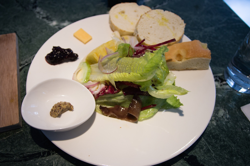 我點的燉鍋附餐,生菜沙拉拌橄欖油醋芥末子醬,值得稱道的是拌得非常勻稱,每片菜葉都沾到醬料,因此吃起來味道均勻。一旁附上三塊手工麵包及果醬、切達起司。麵包略微烤過,水分烤乾了些,因此口感較於酥鬆,除了搭配果醬或起司吃之外,待會也可沾燉鍋的湯汁吃,會比較濕潤點。