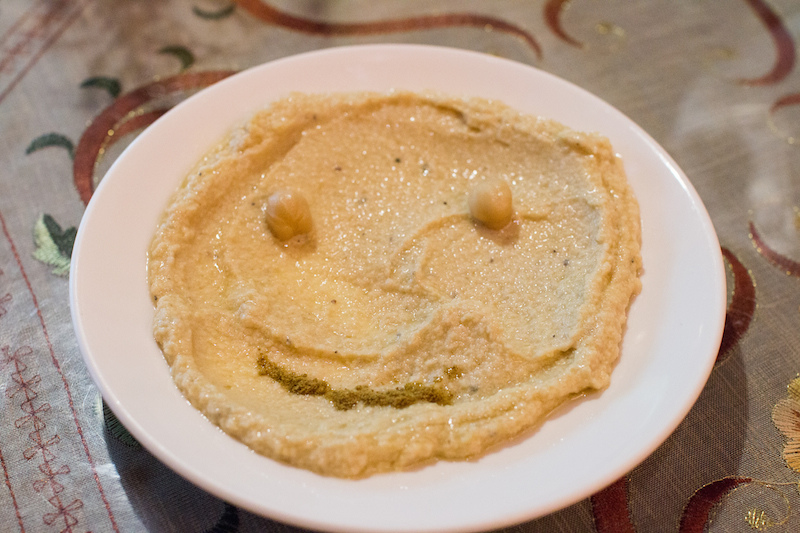 台灣很少見的鷹嘴豆,在中東是常見的食物,其中一種吃法就像這樣磨成豆泥,法老王比較俏皮的是在豆泥上做了個笑臉。我個人頗喜歡吃鷹嘴豆泥,口感綿滑略帶沙感,吃起來酸味略帶澀感,是種很特別的料理,是台灣菜中不會有的味道。