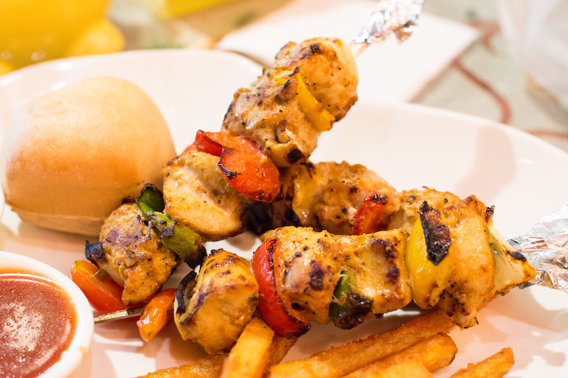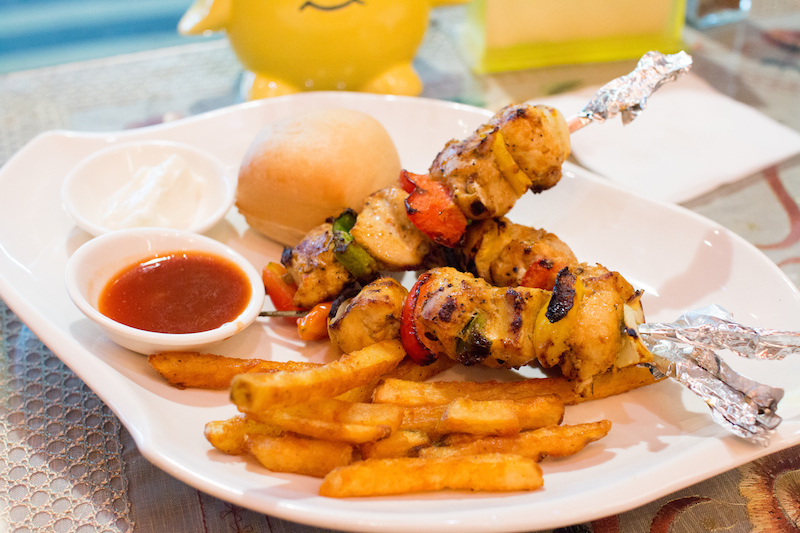 三根鐵串串起雞胸肉、甜椒、番茄、洋蔥串烤,另外附上酥脆的炸薯條以及一塊很像IKEA的小圓麵包。雞肉口感較乾澀,淡淡的香料味,口味不重,配著甜嫩的蔬菜一起入口,味道互補。