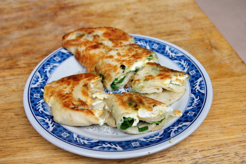 蛋餅皮煎的微微焦脆,手工蛋餅皮口感厚實,外酥餅皮鬆軟,夾著青蔥雞蛋,蔥香十足。比起一般早餐店的蛋餅,份量大了不少,口感當然也不是機器製蛋餅皮能比,不過因為餅皮厚實,自然也比較容易吸油,蛋餅吃起來也就油膩一些,只吃一個就相當有飽足感。