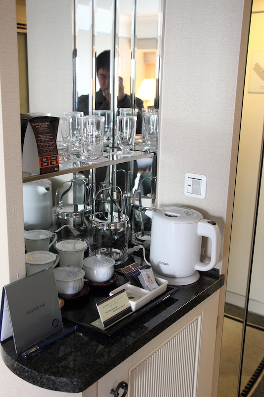 提供熱水壺與茶包,茶具是傳統泡茶的瓷杯。不過日本旅館好像沒有提供免費的礦泉水,或許是因為日本的生水可以飲用的關係吧!