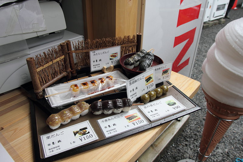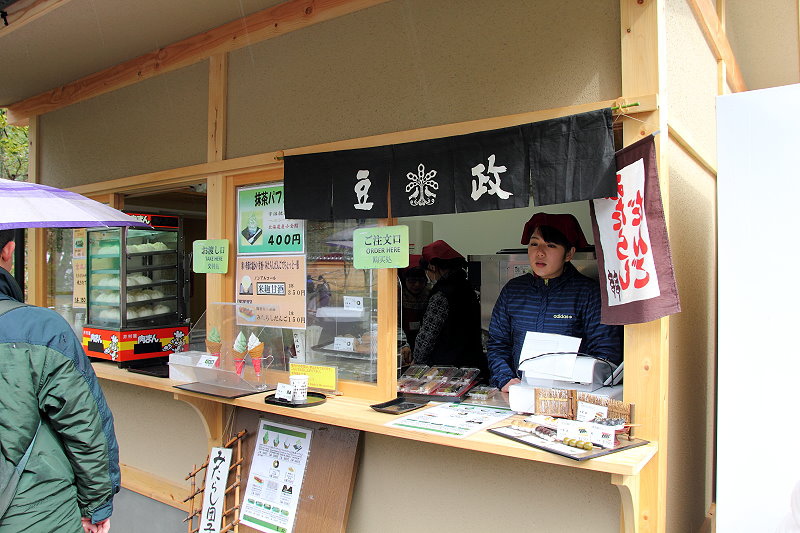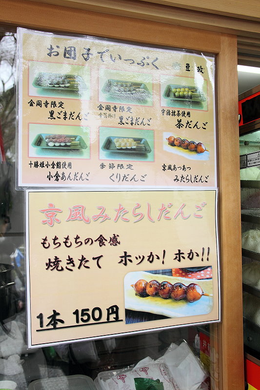 小舖叫做豆政,主要是賣京都風味的團子,還有金閣寺限定。日本真的很喜歡玩限定這一套,在商品名稱上加個地區限定,讓人看了心癢癢,好像離開了這裡就買不到了,產生一種不買可惜的心態,然後就掏出錢包來了。
