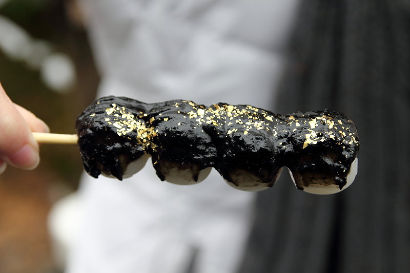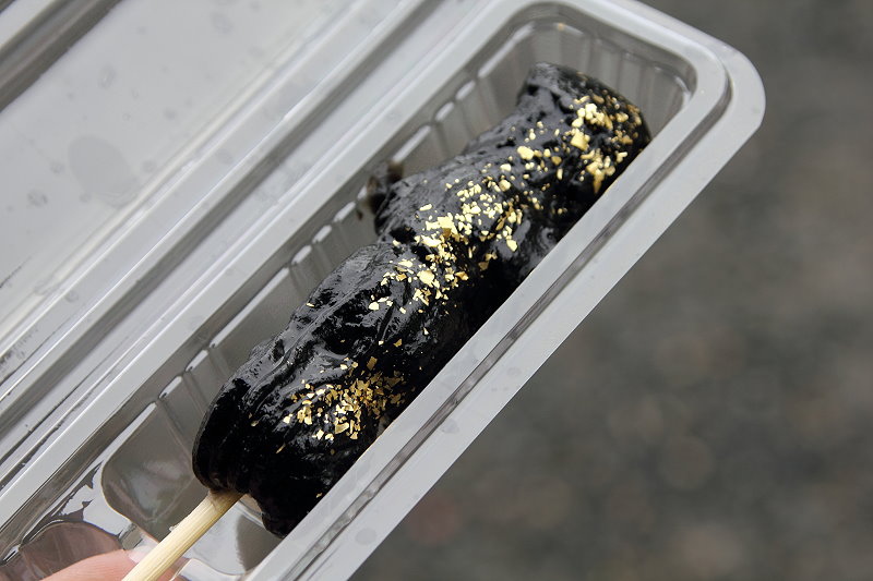 買了一枝金閣寺限定的黑芝麻團子,上頭還撒了些金箔,其實也是好看不好吃,金箔吃起來又沒味道,但配上黑色芝麻醬還真是好看,黑金黑金的。團子的口感就像我們常吃的白湯圓,不過是冷的,也比較硬實一些。表面覆蓋一層濃厚的芝麻醬,可卻不會太過甜膩,也沒有芝麻的苦味,以團子來說,算是相當不錯的。雖然我還是比較喜歡吃烤團子,熱呼呼的鹹甜滋味更好。