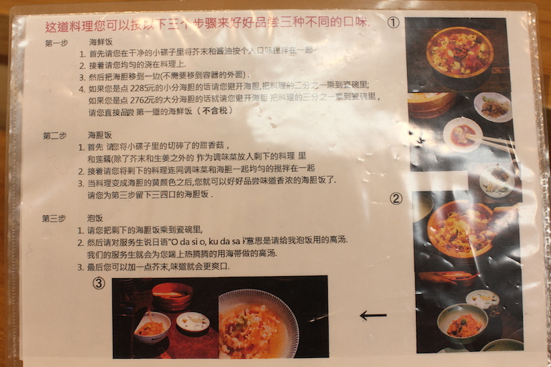 一大早店裡沒什麼人,入座之後直接指明菜單上的海鮮木桶飯。大概是來訪的台灣人很多吧,菜單也有中文,不過只限於海鮮木桶飯的部分,大家應該都是點這道。以中文介紹木桶飯的三種吃法,因為沒什麼客人,所以三種吃法都由店員幫我服務。