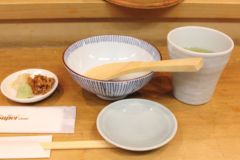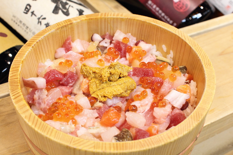 據說用木桶來裝海鮮丼是這家店發明的,點完餐不久,海鮮飯就送了上來,琳瑯滿目的小塊魚料加上散落的晶瑩鮭魚卵與中間的海膽,看起來真是賞心悅目。一大早就能吃如此豐美的早餐,實在是太棒了,多希望台北也能有個像築地市場的地方呀。