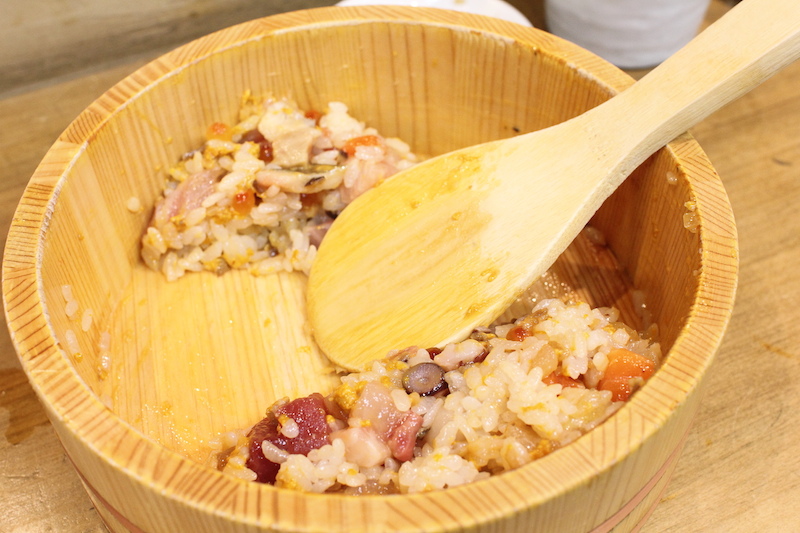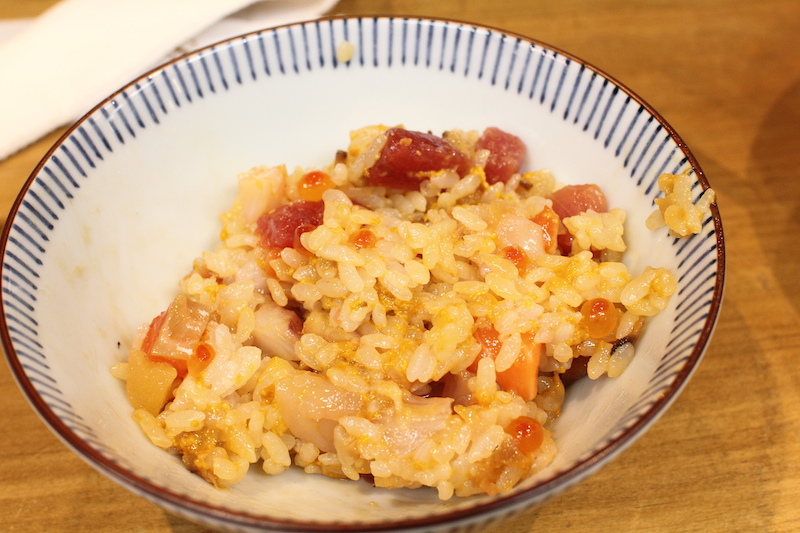 在吃飯的同時,店員幫忙把剩下的海鮮飯與海膽攪拌在一起,其實有點遺憾的是沒有嘗到完整的海膽,不過試試這種吃法也不錯。拌完的海鮮飯裡多了一粒粒金黃的海膽顆粒,也因為海膽而變得稍微有點黏稠。嘗起來的味道則是多了一點海膽的甜味,可惜這海膽品質算是一般,其濃甜的滋味不足,仔細品嘗還能感受到一點明礬味,還好不重。