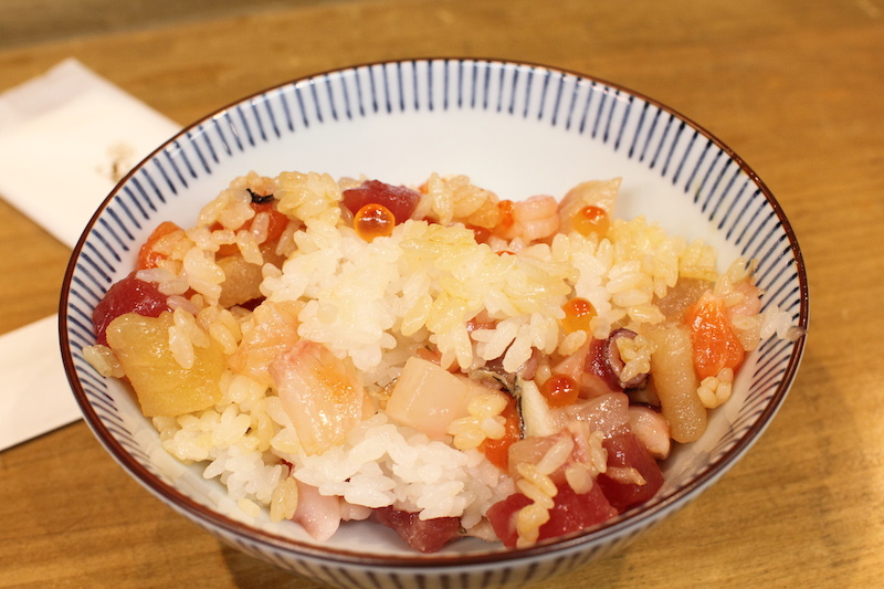 最後剩下一小部分的海鮮飯,則是用來做茶泡飯,利用店家提供的昆布湯頭,沖入醋飯。剛開始覺得頗為奇怪,畢竟是生魚肉與醋飯,沖入熱湯不就變半熟了嗎?這樣味道會好嗎?沖入熱湯之後,魚肉明顯轉白,湯頭也變得有點混濁。實際吃起來卻是相當好味,湯頭有著昆布淡淡香甜,魚肉雖然有點熟了,但還是保持鮮嫩,海膽的味道則是完全被沖淡了,泡了湯的醋飯味道則是沒變怪,配著清甜湯頭入口,在吃完前兩種冷飯吃法後,再喝碗溫暖的熱湯茶泡飯,感覺真好。