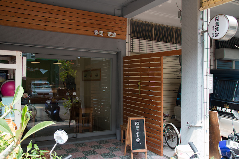 藏在住宅區巷弄裡的阿貴,空間不大,就是個帶點日本風格的小食堂,具有明顯的文青風格,既有反核又有十二夜的旗幟。門口養了一隻拉不拉多吧,應該也是愛狗人士,挺可愛的狗,可是無精打采。